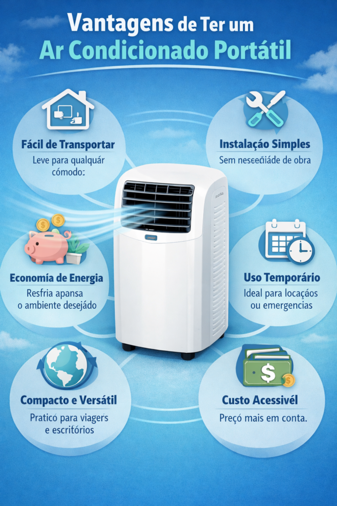 O ar condicionado portátil é um equipamento compacto que pode ser facilmente transportado entre os ambientes. Diferente dos modelos tradicionais, ele não exige instalação fixa complexa, sendo ideal para quem mora em apartamentos, casas alugadas ou deseja flexibilidade.